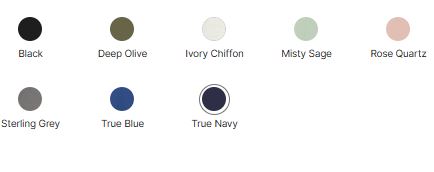 | Color | Misty Sage, Rose, Black, Deep Olive, Ivory Chiffon, Sterling Grey, True Blue, True Navy |